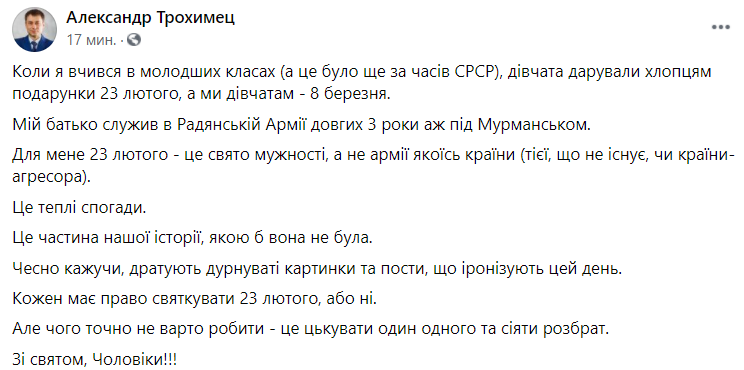Юрист Александр Трохимец призывает перестать критиковать тех, кто отмечает 23 февраля. Поскольку это часть истории миллионов украинцев, служивших в Советской армии.