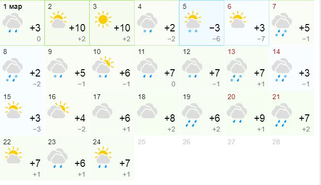 Далее термометры днем покажут +3...+7, ночью 0...-6. Ближе к концу марта днем потеплеет до +8...+9, ночью 0...+2.