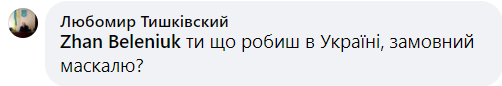 "Что ты делаешь в Украине, заказной москаль" - написал Любомир Тишкивский.