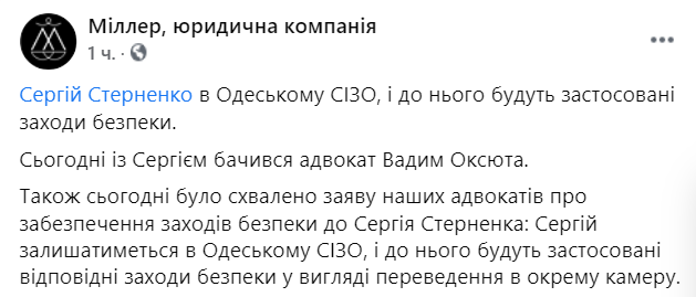 "Сегодня было одобрено заявление наших адвокатов об обеспечении мер безопасности к Сергею Стерненко. Сергей будет оставаться в Одесском СИЗО, и к нему будут применены соответствующие меры безопасности в виде перевода в отдельную камеру", - сообщила в Фейсбуке пресс-служба конторы.