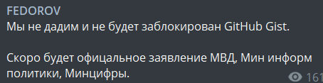 "Мы не дадим и не будет заблокирован GitHub Gist. Скоро будет официальное заявление МВД, Мин информ политики, Минцифры", - заявил он у себя в Телеграме.