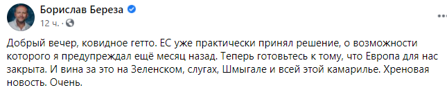 "Добрый вечер, ковидное гетто. ЕС уже практически принял решение, о возможности которого я предупреждал ещё месяц назад. Теперь готовьтесь к тому, что Европа для нас закрыта. И вина за это на Зеленском, слугах, Шмыгале и всей этой камарилье. Хреновая новость. Очень".