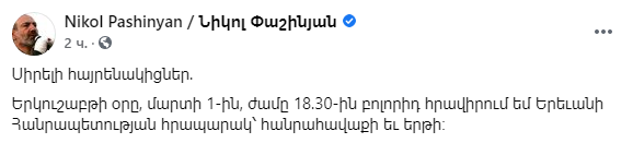 "В понедельник, 1 марта, в 18:30 (16:30 по Киеву - Ред.) приглашаю всех на площадь Республики, где пройдут митинг и шествие", - заявил Пашинян.