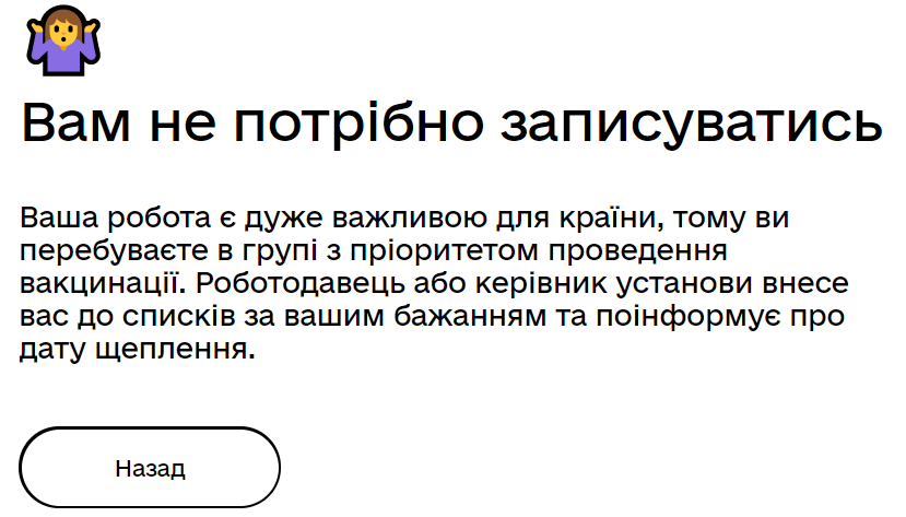 При этом, схитрить и выбрать категорию, которую вакцинируют в первую очередь, невозможно: появляется надпись: "Вам не нужно записываться". И говорится, что вакцинацию обеспечит работодатель.
