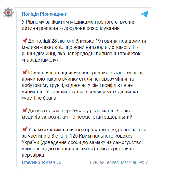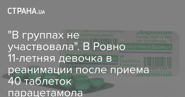 "В группах не участвовала". В Ровно 11-летняя девочка в реанимации после приема 40 таблеток парацетамола