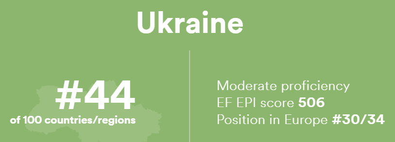 В мировом рейтинге знания английского языков Украина занимает 44-е место из 100 возможных (источник информации - индексе EF EPI 2020 года, - Ред). При этом если брать отдельно Европу, то здесь наши позиции гораздо хуже - 30-е место из 34-х стран.