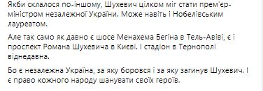 "Но так же как есть шоссе Менахема Бегина в Тель-Авиве, есть и проспект Романа Шухевича в Киеве. И стадион в Тернополе недавно. Потому что есть независимая Украина, за которую боролся и за которую погиб Шухевич. И право каждого народа уважать своих героев", - отреагировал на заявление посла экс-нардеп..