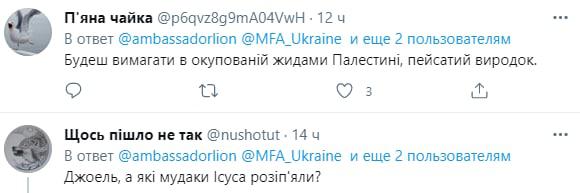 Кроме того, в соцсетях под постом израильского посла поднялась волна хейта. В комментариях пишут, что "ненависть к еврейскому народу растет". Призывают МИД отреагировать и оскорбляют посла, не стесняясь в выражениях.