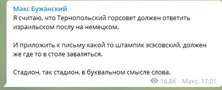 "Я считаю, что Тернопольский горсовет должен ответить израильском послу на немецком. И приложить к письму какой-то штампик эсэсовский, должен же где-то в столе заваляться. Стадион, так стадион, в буквальном смысле слова", - написал депутат "Слуги народа" Максим Бужанский.