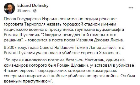 После решения тернопольских депутатов посол Израиля Джоэль Лион потребовал немедленно отменить решение о присвоении тернопольскому стадиону имени Шухевича, которого считают причастным к массовым убийствам евреев на западе Украины.