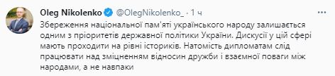 На следующий день украинский МИД отреагировал на заявление израильского посла. Спикер украинского МИД Олег Николенко написал в Твиттере, что сохранение национальной памяти - это приоритет государственной политики Украины.