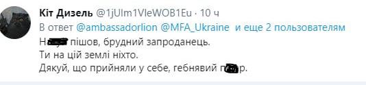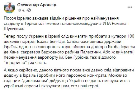 "Свободовец" Александр Аронец в ответ написал, что "данного ватного посла уже давно пора отправить домой в Израиль и сделать его персоной нон-грата", чтобы он не вмешивался в украинские дела и не указывал, кто наши герои.