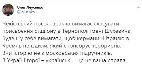 "Мы решительно осуждаем решение Тернопольского городского совета присвоить городскому стадиону имя печально известного Гауптмана СС Романа Шухевича и требуем немедленной отмены этого решения", - написал посол в Твиттере 9 марта. И добавил фото Шухевича в немецкой форме (второй слева в переднем ряду).