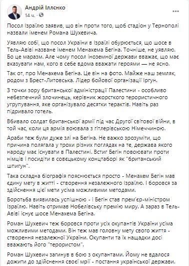 "С точки зрения британской администрации Палестины - особо опасный преступник, руководитель жесткого террористической группировки, которая организовала десятки терактов. Даже раз подрывала отель. Убивала солдат британской армии во время Второй мировой войны, в то время, когда эта армия воевала с гитлеровской Германией... Такая сложная биография объясняется просто - Менахем Бегин имел единственную цель в жизни - создание независимого Израиля. И боролся за осуществление этой цели всеми возможными методами. Борьба оказалась успешной - и Бегин стал премьер-министром Израиля. Даже получил Нобелевскую премию мира... Роман Шухевич тоже боролся против всех оккупантов Украины всеми возможными методами. Он тоже имел главную цель своей жизни - создание независимой Украины. Оккупанты и их потомки до сих пор считают "террористом", - написал Ильенко.