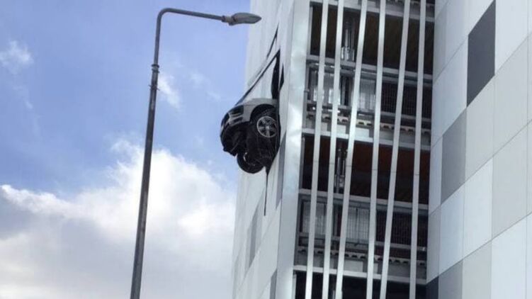 На обнародованных снимках видно, что бампер и передние колеса автомобиля повисли в воздухе.