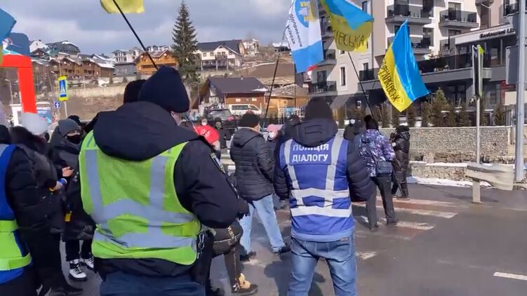 Участники митинга проводят предварительное блокирования курорта, на котором зимой отдыхал президент, беспрерывно двигаясь по пешеходному переходу на въезде. Так они они блокируют движение транспорта. По словам представительницы движения "SaveФОП - Прикарпатье" Людмилы Климчук, среди участников митинга представители среднего бизнеса из Ивано-Франковска, Калуша, Долины и Коломыи.