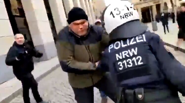 Wie eben angesprochen, eskaliert auch in #Düsseldorf die Situation. Hier ist zu sehen wie ein Demonstrant erst von einem Polizisten geschubst wird. Kurz darauf tritt der Mann einen Beamten im „Kung-Fu-Style“. #d1303 pic.twitter.com/BEO3I7bku8