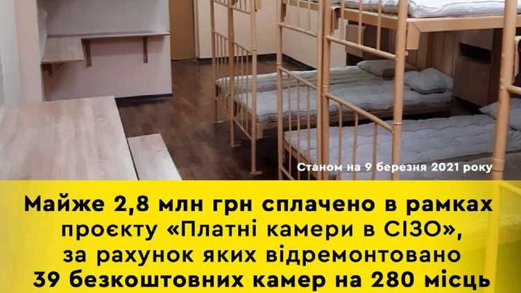 "2 795 326 грн заработали следственные изоляторы Украины благодаря реализации проекта платных камер. Все средства, заработанные в ходе эксперимента, направляются на восстановление бесплатных камер следственных изоляторов. Так, по состоянию на 9 марта этого года, обновлено 39 бесплатных камер на 280 мест.