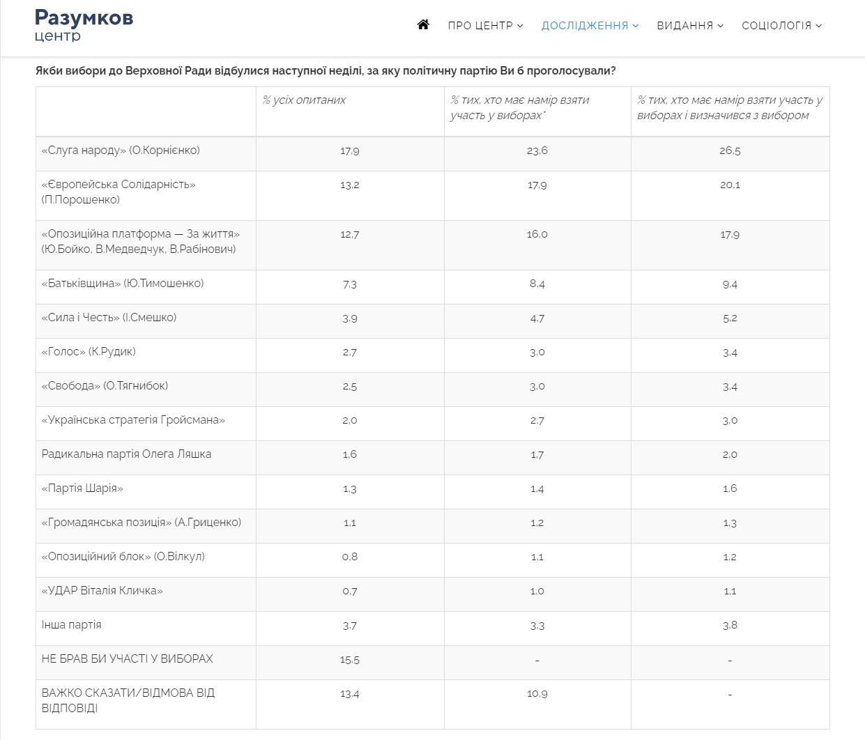 Если бы выборы в Верховную Раду состоялись бы в ближайшее время, то в парламент прошли бы четыре партии: "Слуга народа", "Оппозиционная платформа - За жизнь", "Евросолидарность" и "Батькивщина".
