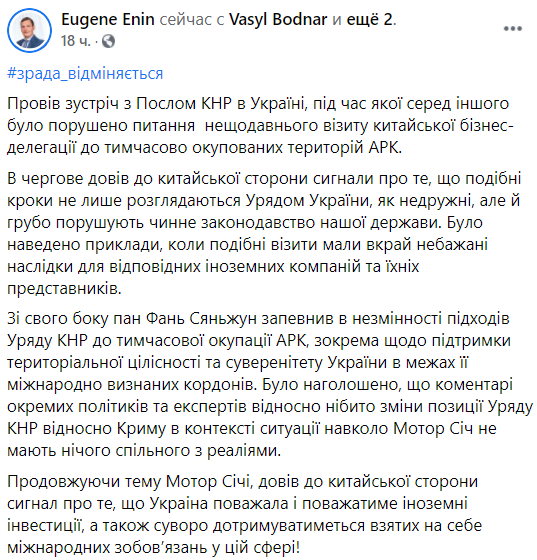 Руководство Украины прокомментировало данный визит уже потом -  и на удивление осторожно. Замглавы МИД Евгений Енин встретился с послом Китая и после встречи написал - "зрада отменяется".