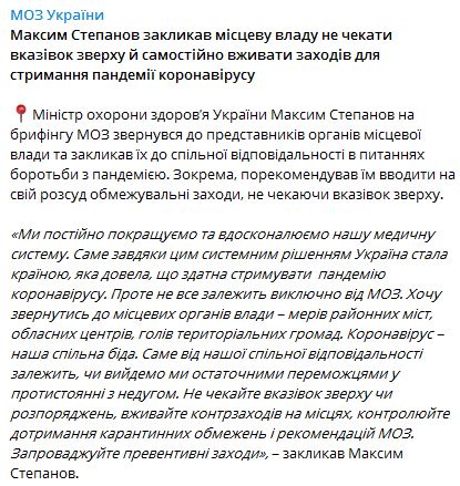 "Не все зависит исключительно от Минздрава. Хочу обратиться в местные органы власти - мэров районных городов, областных центров, председателей территориальных общин... Не ждите указаний сверху или распоряжений, употребляйте контрмеры на местах, контролируйте соблюдение карантина и рекомендациями Минздрава. Вводите превентивные меры", - призвал министр.