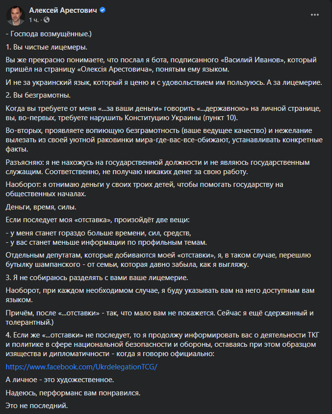 "Господа возмущённые. Вы чистые лицемеры. Вы же прекрасно понимаете, что послал я бота, подписанного "Василий Иванов", который пришёл на страницу "Олексія Арестовича", понятым ему языком. И не за украинский язык, который я ценю и с удовольствием им пользуюсь. А за лицемерие.