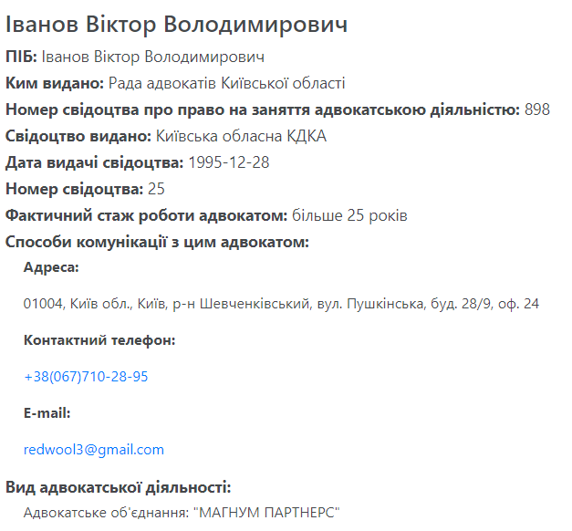 На юридических сайтах действительно есть анкета адвоката с такими данными. Указывается, что у него более 25 лет адвокатской практики