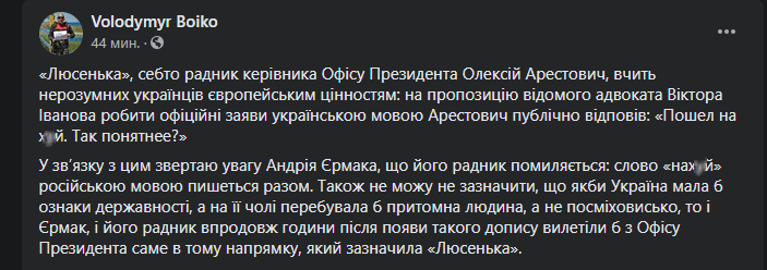 Советник украинской делегации в трехсторонней контактной группе по урегулированию ситуации на Донбассе Алексей Арестович в комментариях под своим постом в Facebook послал на три буквы пользователя, который попросил его писать на украинском языке.