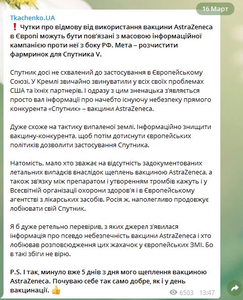 Я бы очень тщательно проверил, из каких источников появилась информация о псевдо опасности вакцины AstraZeneca и кто лоббировал распространения этих жахачок в европейских СМИ. Потому что в такие совпадения не верю" - написал министр в Telegram.