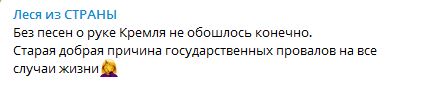 "Без песен о руке Кремля не обошлось, конечно. Старая добрая причина государственных провалов на все случаи жизни", -  отреагировала ведущая блога "Ясно.Понятно" Олеся Медведева.