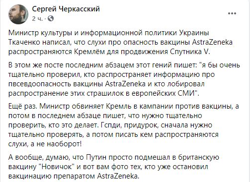 "Министр обвиняет Кремль в кампании против вакцины, а потом в последнем абзаце пишет, что нужно тщательно проверить, кто это делает. Господи, придурок, сначала нужно тщательно проверять, а потом писать, кем распространяются слухи, а не наоборот!