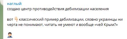 "Создаю центр противодействия дебилизации населения. Вот классический пример дебилизации, словно украинцы ни черта не понимают, читать не умеют и вообще "чей Крым?", - отреагировал на пост Ткаченко журналист Макс Назаров.