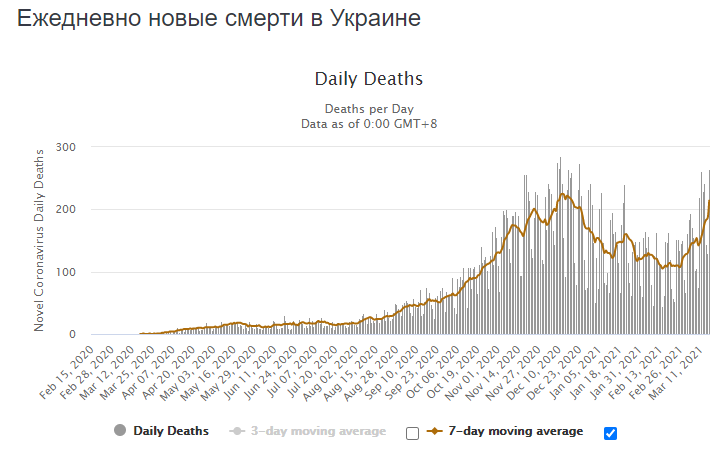 В Национальной академии наук Украины отметили, что в недельном цикле до 16 марта за день в среднем фиксировали 213 смертей среди пациентов с Covid-19. Такой стремительный рост смертности вызывает наибольшее беспокойство среди ученых, поскольку предыдущий средненедельный рекорд смертности был зафиксирован 12 декабря 2020 года.