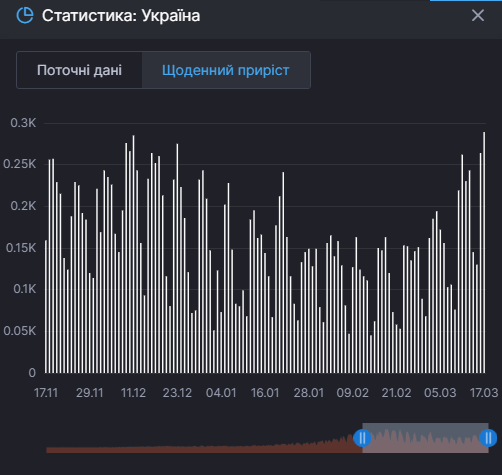 16 марта было 264 новых случая смерти в Украине, 15 марта - 130 смертей, 14 марта - 145, 13 марта - 243, 12 марта - 230, 11 марта - 262, 10 марта - 219, 9 марта - 76, 8 марта - 106, 7 марта - 103, 6 марта - 156, 5 марта - 172, 4 марта - 194, 3 марта - 185, 2 марта - 162, 1 марта - 68.