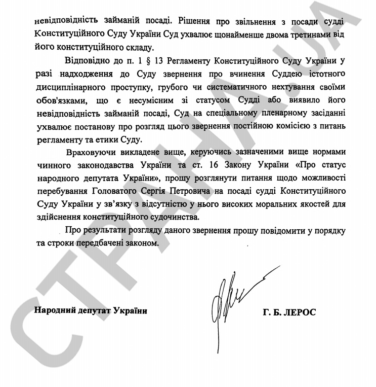 Основанием для этого стали обращения лидера Братства Корчинского и нардепа Лероса. Причём последний аргументирует необходимость убрать Головатого тем, что он... был в числе депутатов, голосовавших в 2010 году за Харьковские соглашения", - комментирует ситуацию телеграм-канал "Политика Страны"