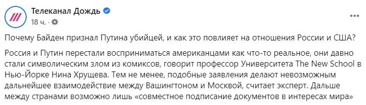 Новость о том, что Джо Байден назвал Владимира Путина убийцей, стала одной из самых цитируемых за вчерашний день.