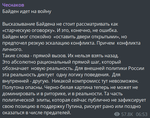 Глава Центра политической конъюнктуры Алексей Чеснаков, близкий к экс-помощнику Путина Суркову, заявил, что "Байден идет на войну".