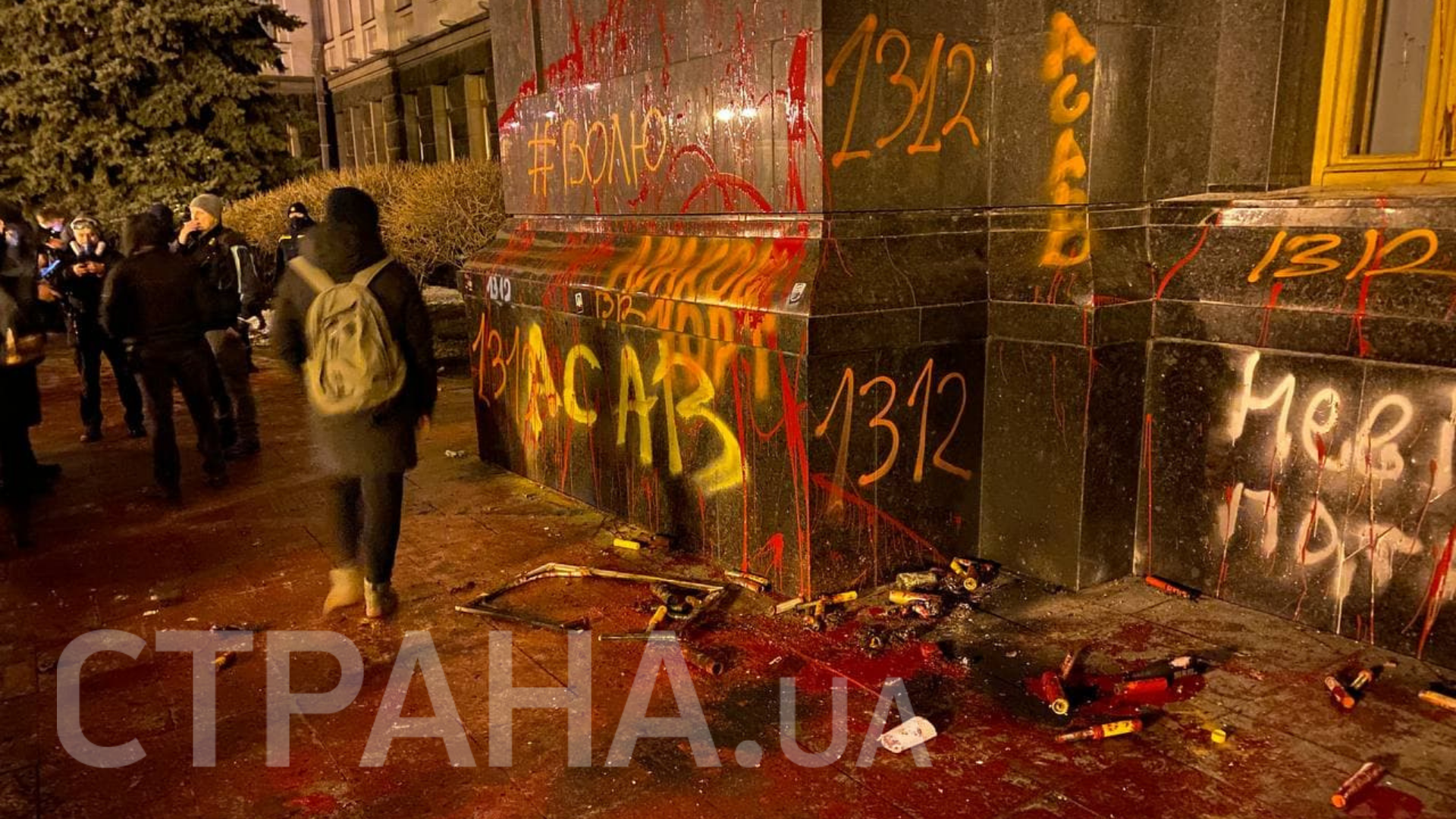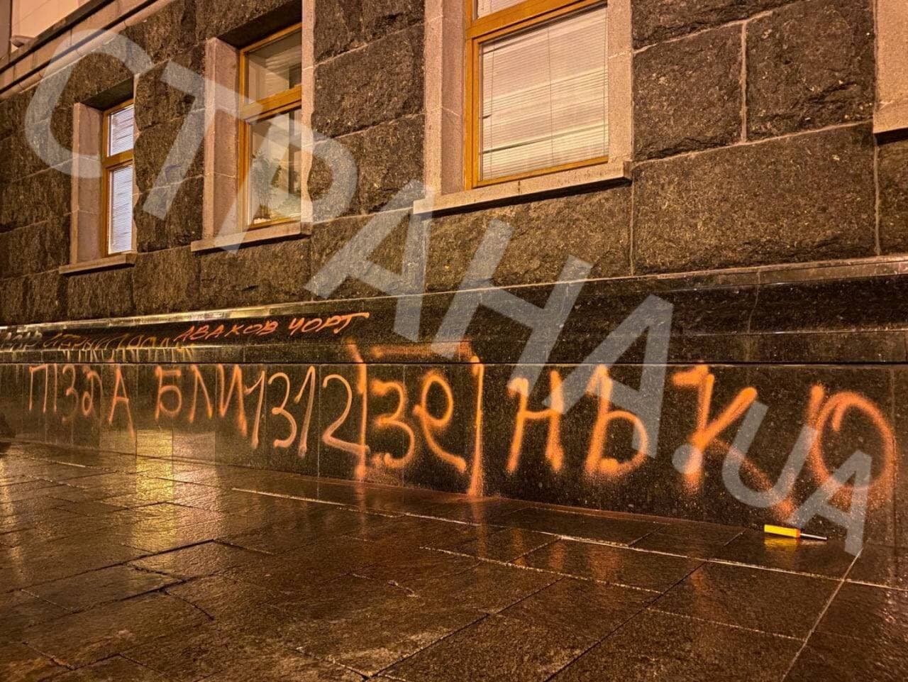19:50 Стены и двери ОП обрисовали надписями "Волю Стерненко". Акция одномоментно стала радикальной.