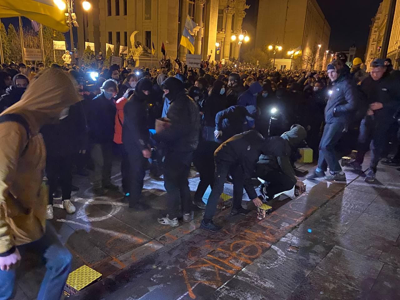 19:45 Жгут файеры и взрывают петарды, бросая их в здание офиса президента. При этом кричат "Аваков черт".