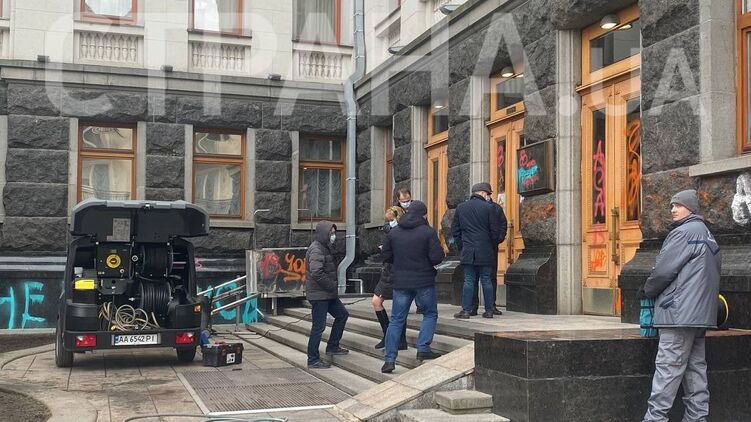 В Киеве начали отмывать надписи с фасада Офиса президента на Банковой, где в субботу националисты устроили погром.