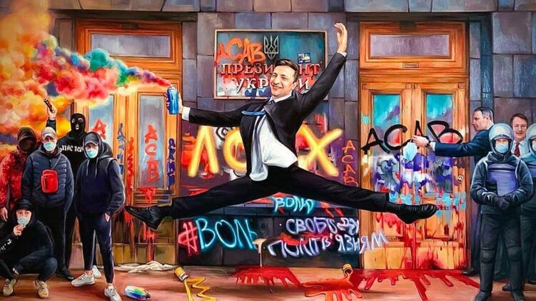 На картине изображен разрисованный радикалами фасад здания Офиса президента. В центре, на фоне надписи "Лох", – человек, похожий на президента Владимира Зеленского. Он, улыбаясь, подпрыгивает и держит в руках дымовую шашку с цветным дымом. На втором плане с одной стороны от него – участники погрома на Банковой, с другой – полиция, человек, похожий на замглавы МВД Антона Геращенко, и еще один – похожий на мэра Киева Виталия Кличко.