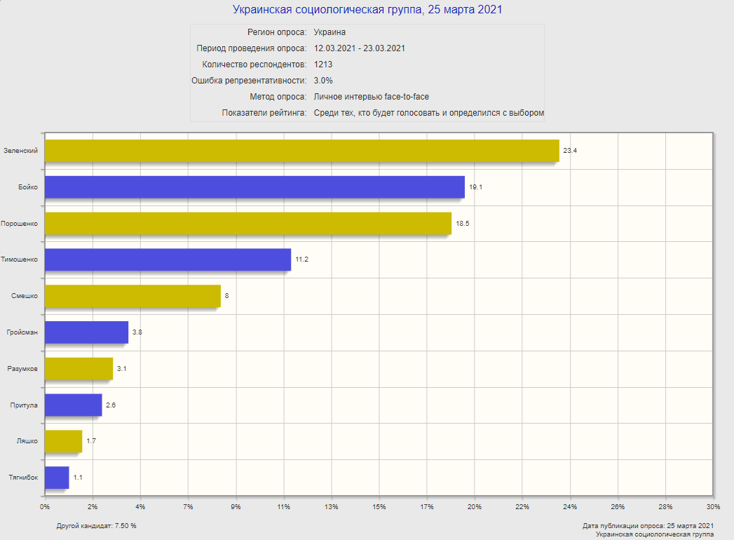 Следом за действующим президентом - сопредседатель парламентской фракции "Оппозиционная платформа - За жизнь" Юрий Бойко с поддержкой 19,1%. Замыкает тройку лидеров экс-президент и сопредседатель фракции "Европейская солидарность" в Раде Петр Порошенко - 18,5%. Об этом свидетельствуют результаты опроса Украинской социологической группы, опубликованные 25 марта.