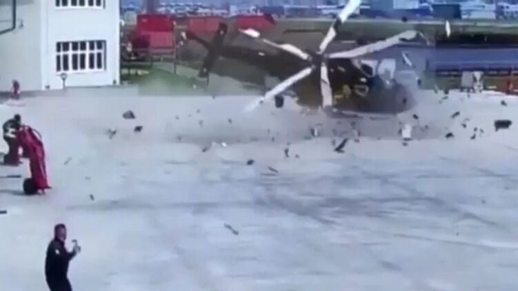 На кадрах видно, как вертолет AgustaWestland AW169, экипаж которого готовился ко взлету, внезапно начал раскручиваться вокруг своей оси, после чего завалился на бок и сломал лопасти.