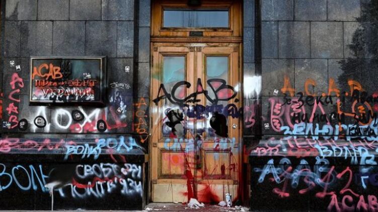 "Кто пытался поджечь государственный герб Украины на табличке на входе в Офис Президента, ломал двери и окна и рисовал свастику на стене - каждый должен ответить по закону за то, что сделал, в той мере, как сделал", - добавила Мендель.