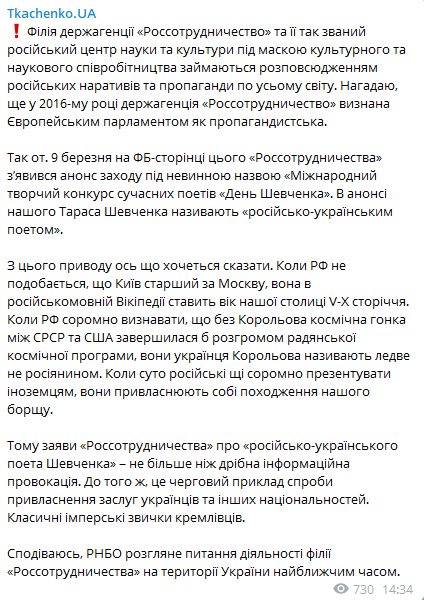 "Само название мероприятия дезинформирует украинское и мировое сообщество о том, что украинский поэт, национальный герой и символ Украины Тарас Григорьевич Шевченко был "русско-украинским поэтом". Но больше настораживает и беспокоит то, что на седьмом году войны в Киеве совершенно открыто функционирует представительство российского пропагандистского агентства Россотрудничество. Это при том, что в России закрыты все украинские центры, преследуются украинские общественные деятели и Всемирный конгресс украинцев признан как нежелательная в РФ организация", – подчеркнул Садоха 10 марта.
