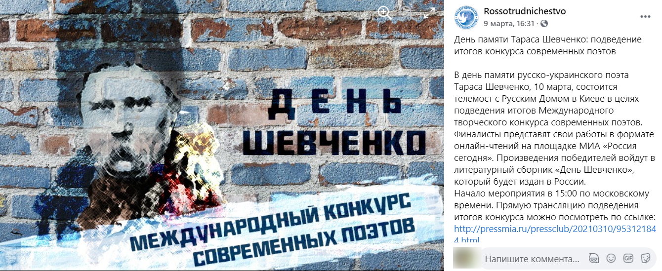 "Наш "Русский дом" в Киеве в начале марта провел чудесный поэтический конкурс, в самые "Шевченковские дни", – "День Шевченко", хорошего русско-украинского поэта и писателя. Почему? Ну, во-первых, мы считаем, что не дело "приватизировать" Шевченко по причинам политики, тем более, что прозу он вообще в основном на русском языке писал, много поэзии – по-русски. И вообще, с чего это нам разбрасываться поэтами и дарить их свидомым националистам-русофобам.