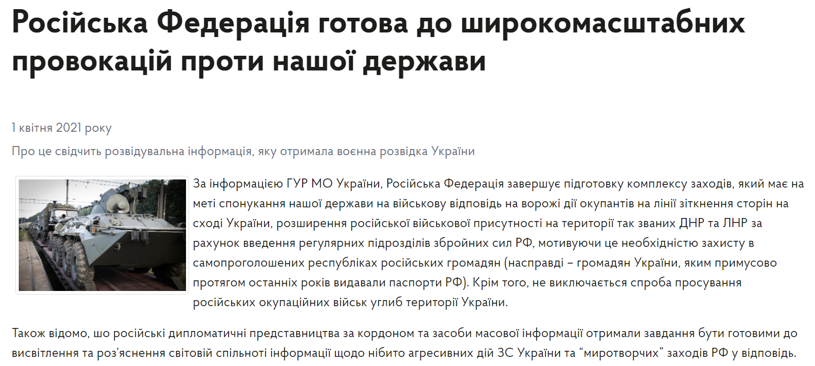 "По информации ГУР МО Украины, Российская Федерация завершает подготовку комплекса мероприятий с целью побуждения нашего государства на военный ответ на враждебные действия оккупантов на линии соприкосновения сторон на востоке Украины, расширение российского военного присутствия на территории так называемых "ДНР" и "ЛНР" за счет введения регулярных подразделений вооруженных сил РФ, мотивируя это необходимостью защиты в самопровозглашенных республиках российских граждан (на самом деле - граждан Украины, которым принудительно в течение последних лет выдавали паспорта РФ). Не исключается попытка продвижения российских войск вглубь территории Украины. Также известно, что российские дипломатические представительства и средства массовой информации получили задание быть готовыми к освещению и разъяснению мировому сообществу информации о якобы агрессивных действий ВС Украины и "миротворческих" мероприятий РФ в ответ", - заявляют в ГУР.