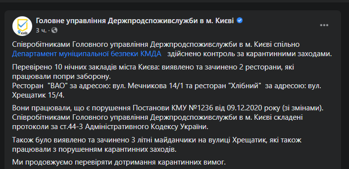 В Госпотребслужбе рассказывают, что заведения работали, а это является нарушением постановления КМУ №1236 от 09.12.2020 года. Кроме того, закрыты три летние площадки на Крещатике, которые также работали с нарушениями.