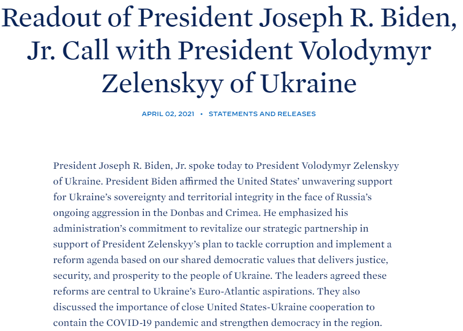"Президент Джозеф Байден-младший сегодня поговорил с Президентом Украины Владимиром Зеленским. Президент Байден подтвердил неизменную поддержку США суверенитета и территориальной целостности Украины перед лицом продолжающейся агрессии России на Донбассе и в Крыму.