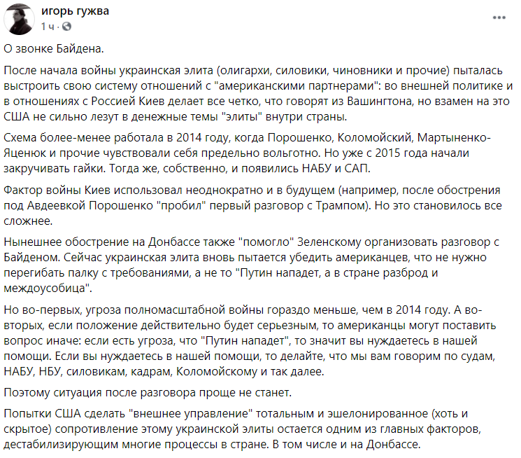 "О звонке Байдена. После начала войны украинская элита (олигархи, силовики, чиновники и прочие) пыталась выстроить свою систему отношений с "американскими партнерами": во внешней политике и в отношениях с Россией Киев делает все четко, что говорят из Вашингтона, но взамен на это США не сильно лезут в денежные темы "элиты" внутри страны.